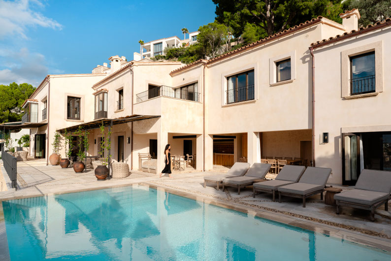 El interior, refleja su naturalidad con los revestimientos en mortero de arcilla, suelo de piedra mallorquina envejecida, vigas vistas y carpintería de madera.