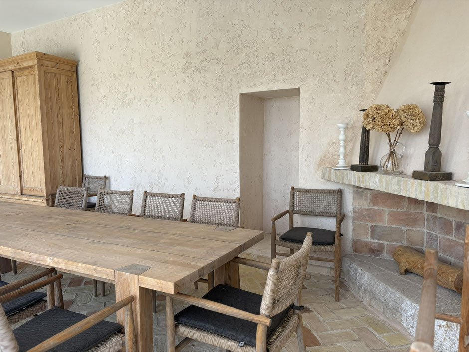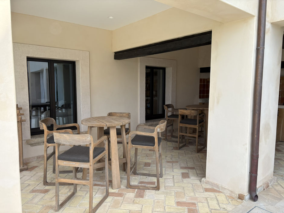 Zonas exteriores donde luce carácter único; los ladrillos recuperados aportan calidez y textura, las paredes de yeso de Albarracín se funden con el paisaje gracias a sus tonos y acabado artesanal, y los muebles de madera maciza, completan un ambiente sereno y lleno de autenticidad.
